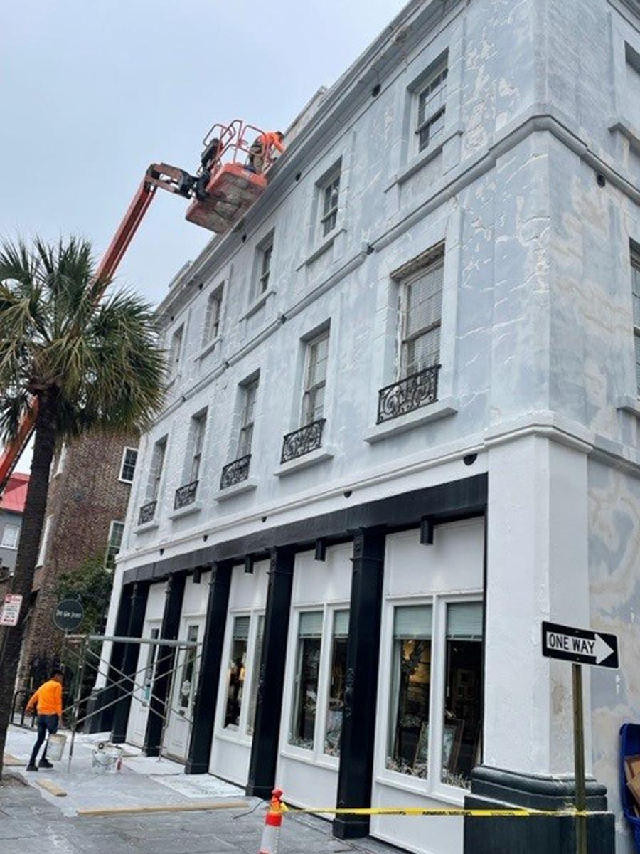 180 East Bay Street, originally built in 1794 and renovated in the 1980s, required the demolition and rework of the exterior stucco before a full exterior repaint. The project initially involved simple exterior prep and repainting, but it expanded after discovering deteriorated structural components and stucco damage. Peters, along with a local engineer, was hired to repair the structural issues and replace most of the stucco, including the lath, base, and finish layer, ensuring it was suitable for a Class A substrate for priming and finishing.