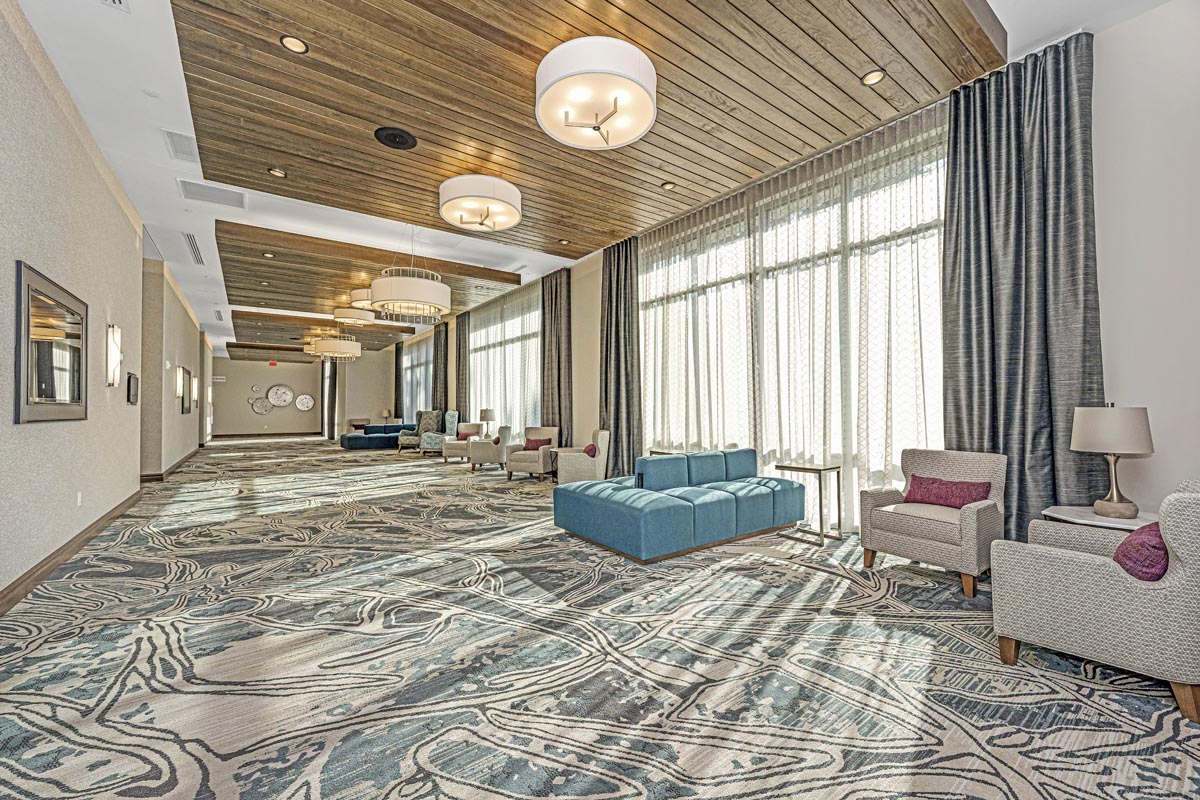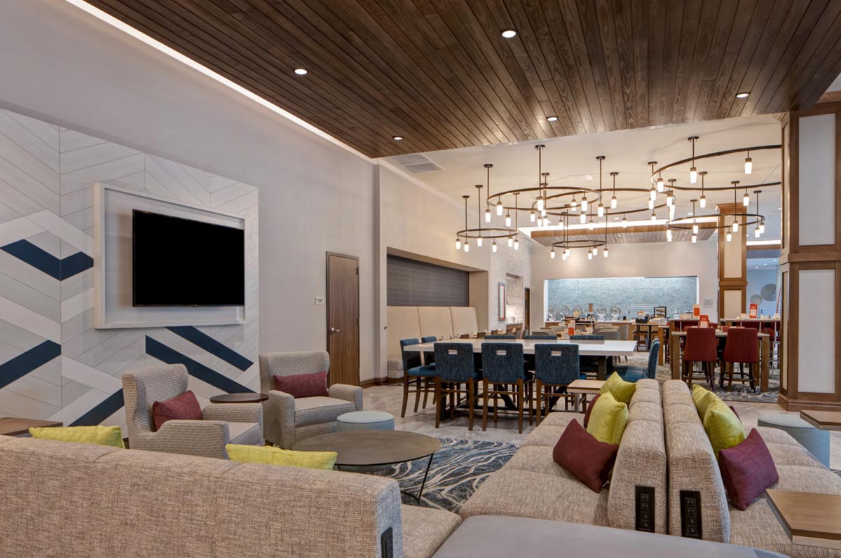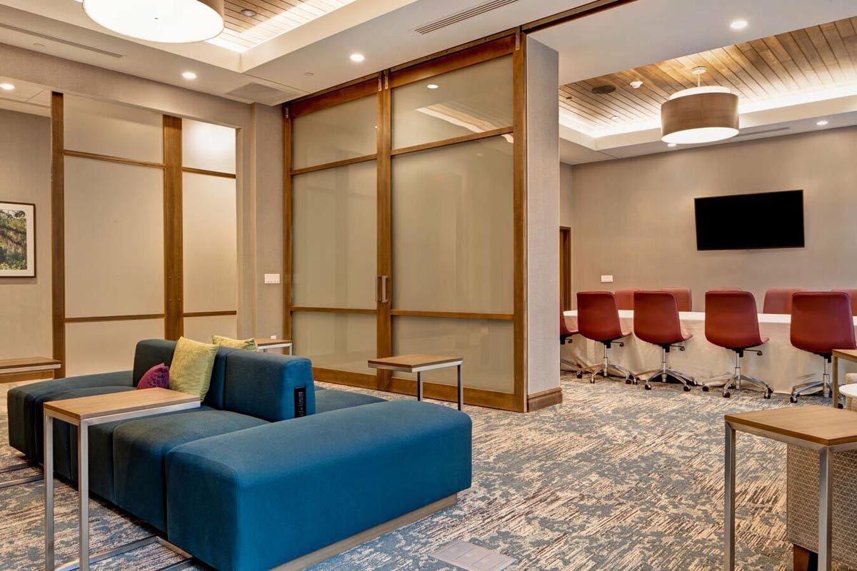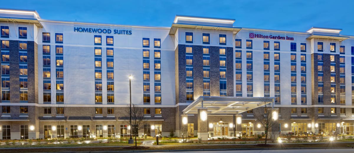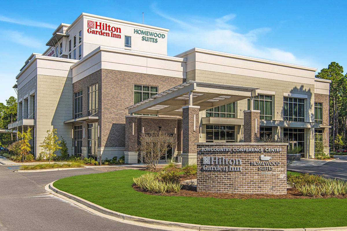 The Hilton Garden Inn & Homewood Suites hotel and Lowcountry Conference Center in Summerville, SC, sits within the Nexton community. The dual-brand concept caters to both select service and extended stay hotel customers through one property. This eight-story structure with 250 guest rooms is the tallest building in Summerville and Berkeley County. A two-story, 36,000 square foot conference center is attached to the hotel. This project featured 25 different wallcovering patterns and 24 different paint colors.